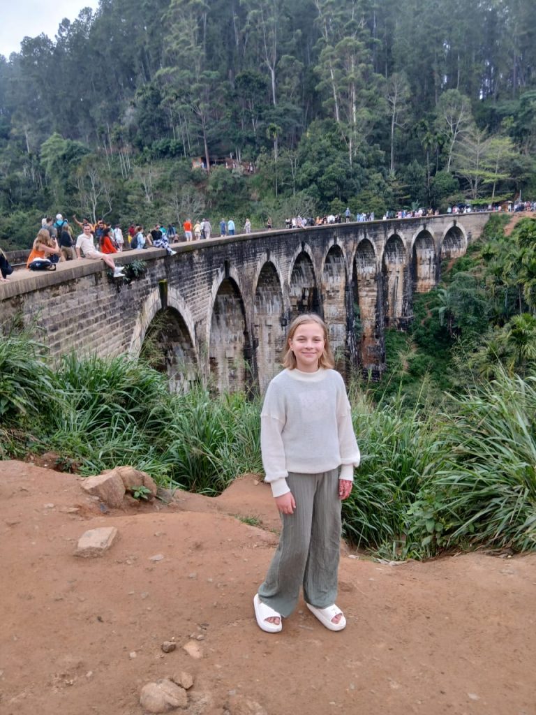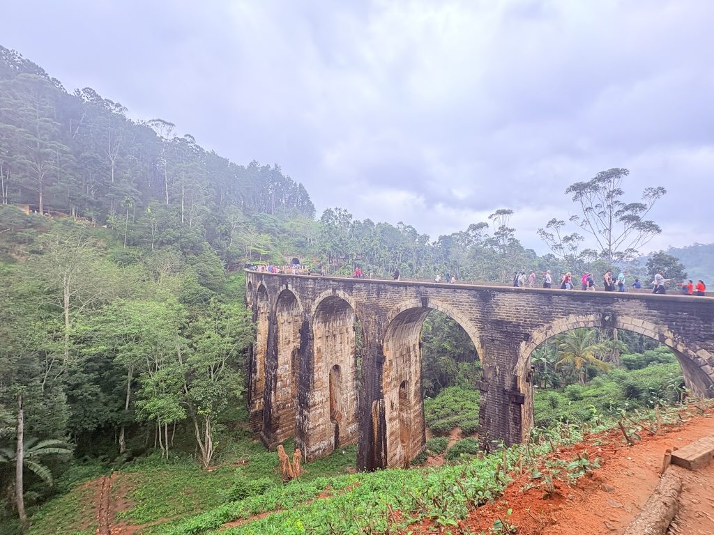 Ein Stück fuhren wir mit Nirosh und seinem Onkel im Bus, dann weiter mit dem TukTuk, das letzte Stück zu Fuß durch sattes Grün. Und plötzlich stand sie vor uns: diese geschwungene, fast 100 Jahre alte Eisenbahnbrücke aus Naturstein, eingebettet in dichten Dschungel.