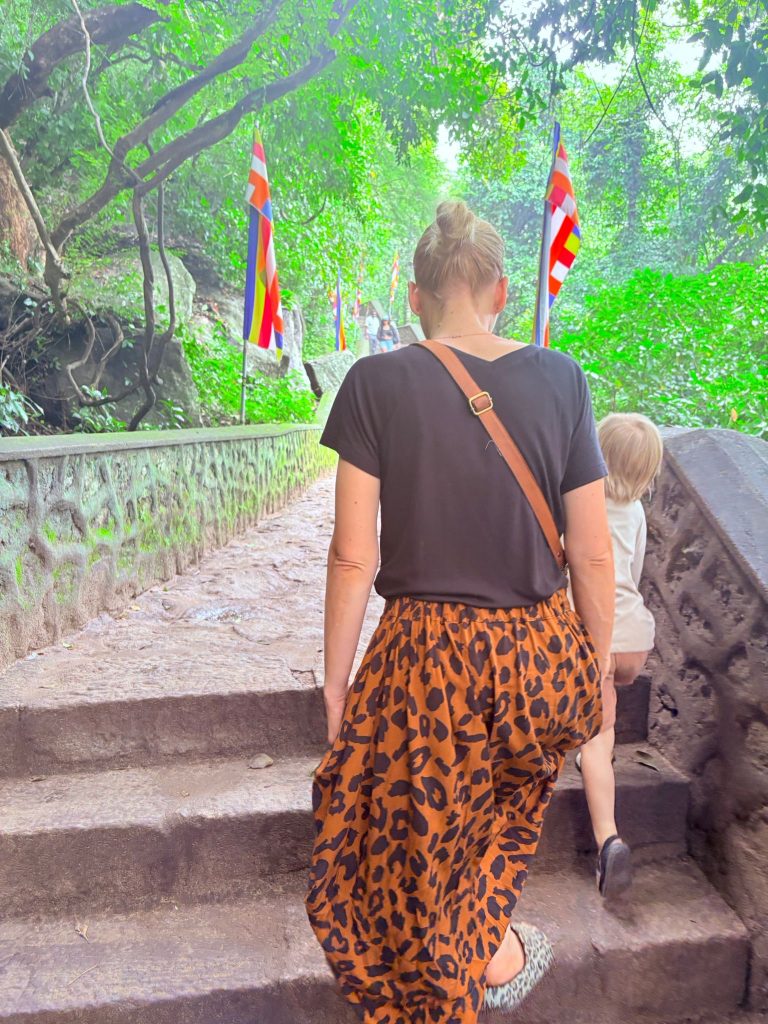 Der Aufstieg war anspruchsvoll. Florin bestand darauf, getragen zu werden. Und Carsten schleppte tapfer. Oben angekommen: Höhlen, in den Fels geschlagen, gefüllt mit Buddha-Statuen und jahrhundertealten Wandmalereien. Der Tempel stammt aus dem 1. Jahrhundert v. Chr. und gehört zu den bedeutendsten Höhlentempeln Sri Lankas.