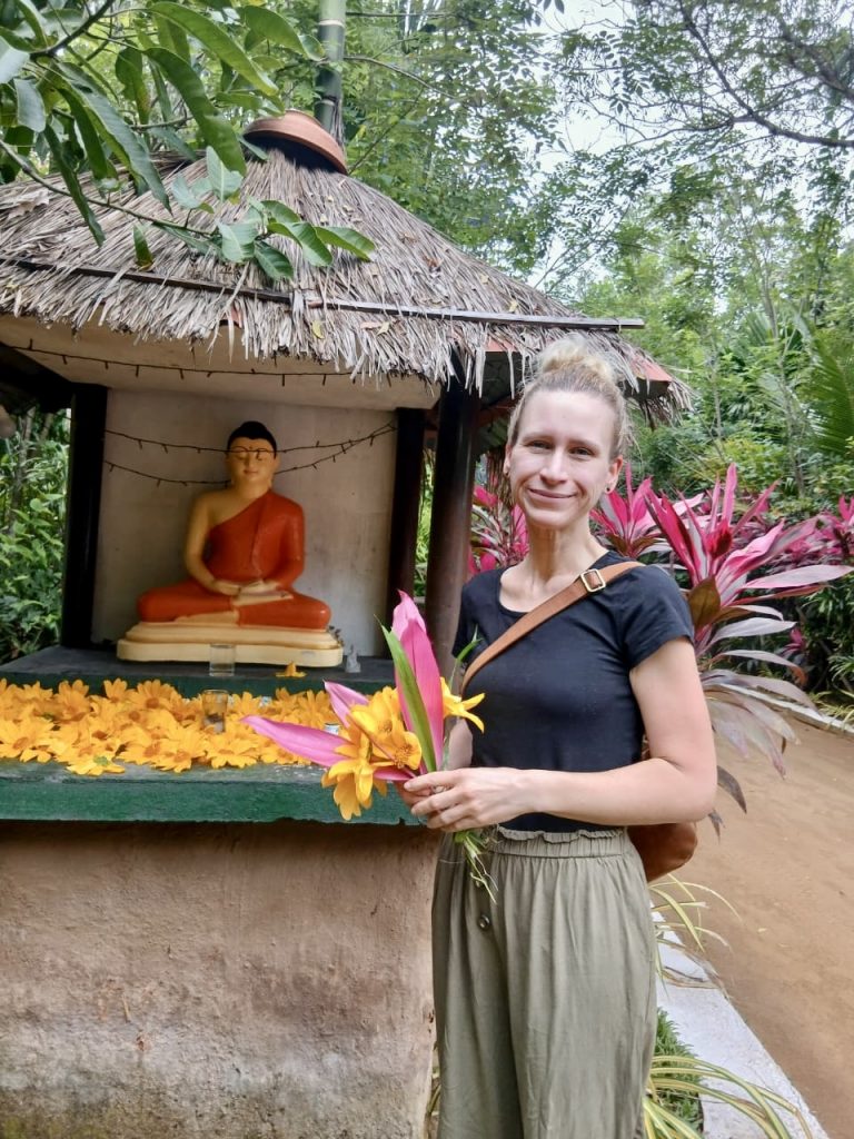 Pubuduni erklärte uns, dass dieser Mönch in einem früheren Leben ein schlechter Mensch gewesen sei, der andere geschlagen habe. Als Konsequenz sei er als blauer Mensch wiedergeboren worden.