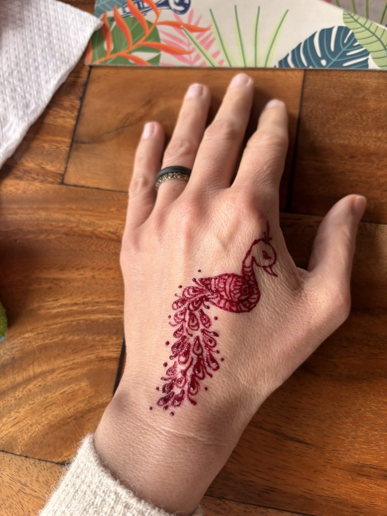 In einem winzigen Laden mit handgenähten Spielsachen entdeckten wir eine junge Frau, die Henna anbot. Valentina wählte ein Motiv nach Vorlage, ich ließ sie frei gestalten. Ihr filigran und präzise, meins intuitiv und verspielt. Ein hübscher Urlaubs-Mädchenkram.