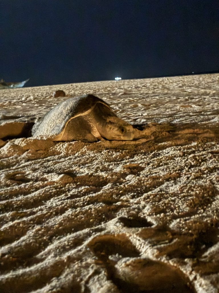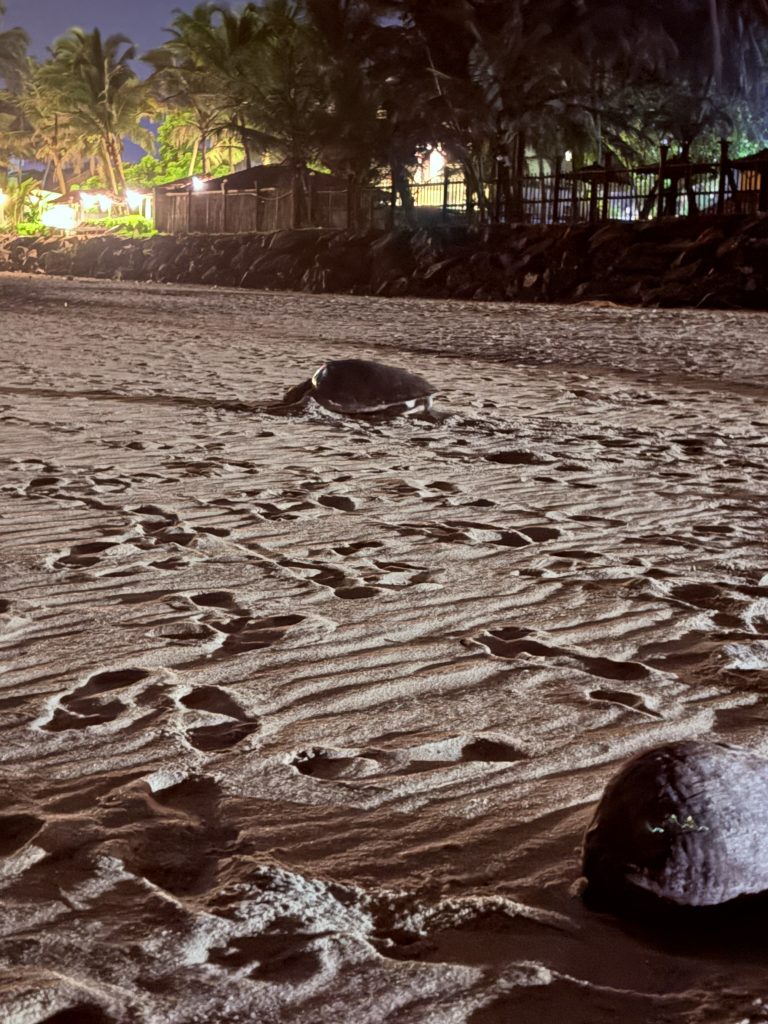 Er schimmerte leicht fluoreszierend. Nighti erklärte uns später, dass dieser Effekt häufig entsteht, wenn Schildkröten lange im offenen Meer unterwegs waren und sich auf ihrem Panzer Mikroorganismen oder Algen abgesetzt haben. Ein Zeichen dafür, dass sie eine lange Reise aus dem tiefen Ozean hinter sich haben kann. Der eigentliche Vorgang dauerte ungefähr 25 Minuten. Ei für Ei fiel in das Nest.